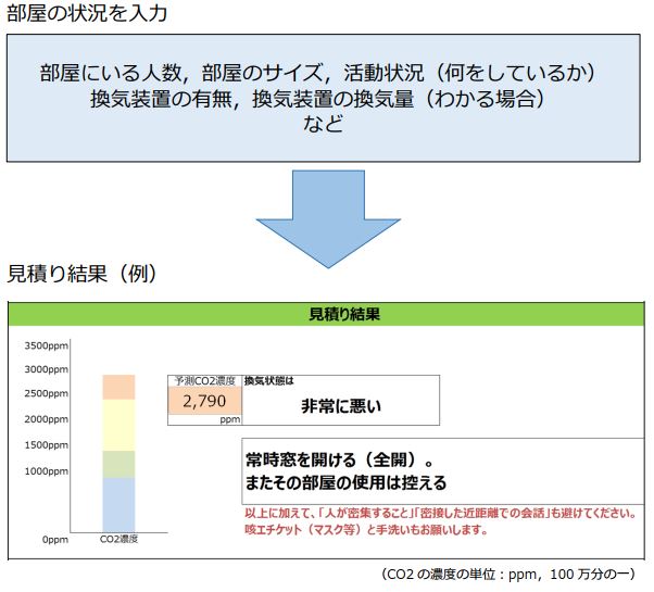 部屋にいる人数,部屋のサイズ,室内での活動状況,換気装置の条件などを入力することにより,室内の二酸化炭素(CO2)の濃度を推定し,これにもとづいて換気の良し悪しを見積ります。事務室,会議用の部屋,集会などの場所,家庭内など,屋内のさまざまな状況で利用できます。
