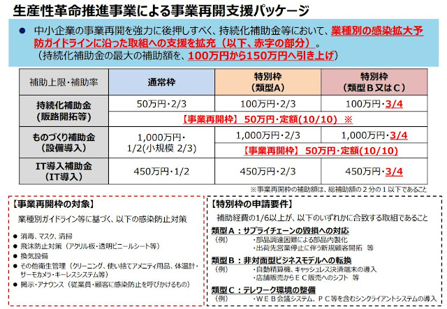 2020年5月22日、経済産業省は中小企業生産性革命推進事業による「事業再開支援パッケージ」を策定し、3補助金(持続化補助金・ものづくり補助金・IT導入補助金)の特別枠の支援内容拡充と、事業再開を後押しするために事業再開枠を新設しました。