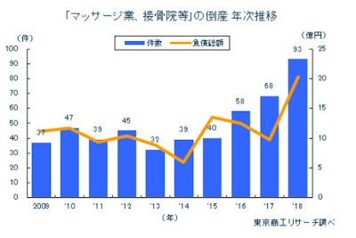 さらに、最近は無資格のマッサージ店なども林立し、競争激化に拍車をかけていて、業者間の過当競争が沈静化する気配はうかがえない。また、創業者支援の制度融資も「マッサージ業、接骨院等」の起業を促す要因になっているとの見方もある。